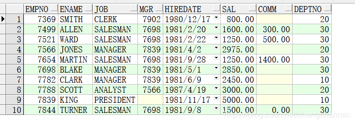 左连接查询【查询部门编号为10的所有员工部门编号,雇员名称,工作信息】,以左为主表查询数据。