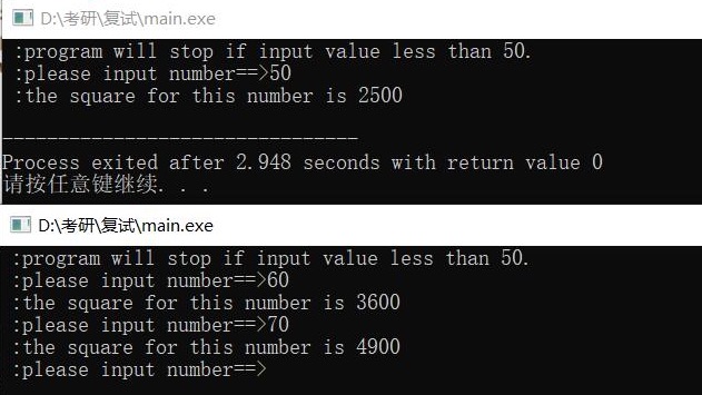 c++环境中,宏#define命令练习 例子代码注://当输入的数小于等于50时,会执行乘方指令但是会退出;若大于50,则可以一直输入下去。重难点:define的理解。宏替换,避免冗余输入。操作:代码如图所示,运行结果如图所示。