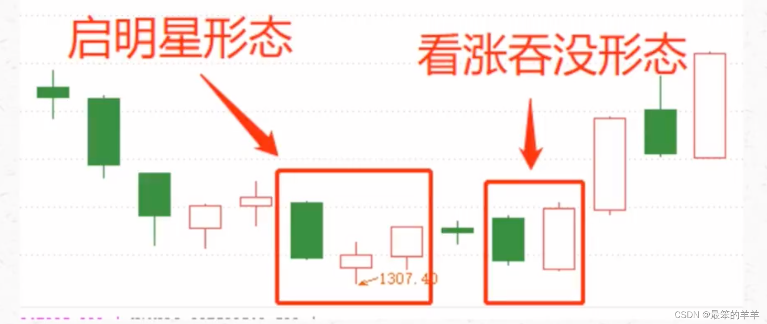 - 非理想形态的启明星形态,在行情底部出现,也具备一定的反转信号