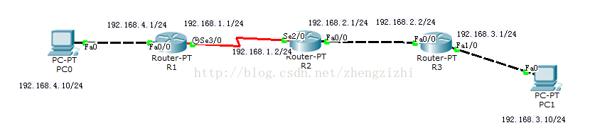 3种方式的拓扑图完全一样,不一样的地方是在路由指令操作方面: ip route 目标网络地址 子网掩码 下一跳地址