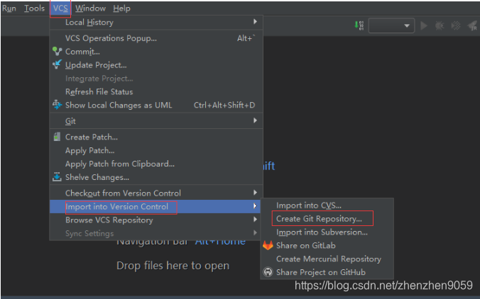 1.在idea的菜单项选择 VCS》Import into Version Control》Create Git Repository
