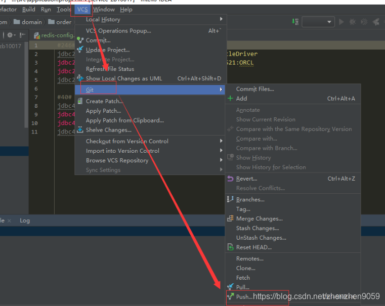 6.提交完成之后,只是提交到本地仓库,这个时候还没有同步到远程的gitlab服务上,需要push操作,VCS》Git》Push