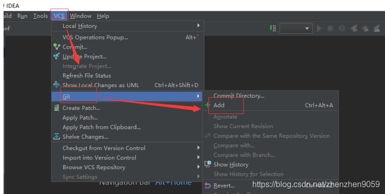 5.在回到idea项目中,点击VCS》Git》Add添加当前项目下的文件,添加完成之后,之前的红色文件名变成了绿色了,表示已经Add成功,但还没有commit