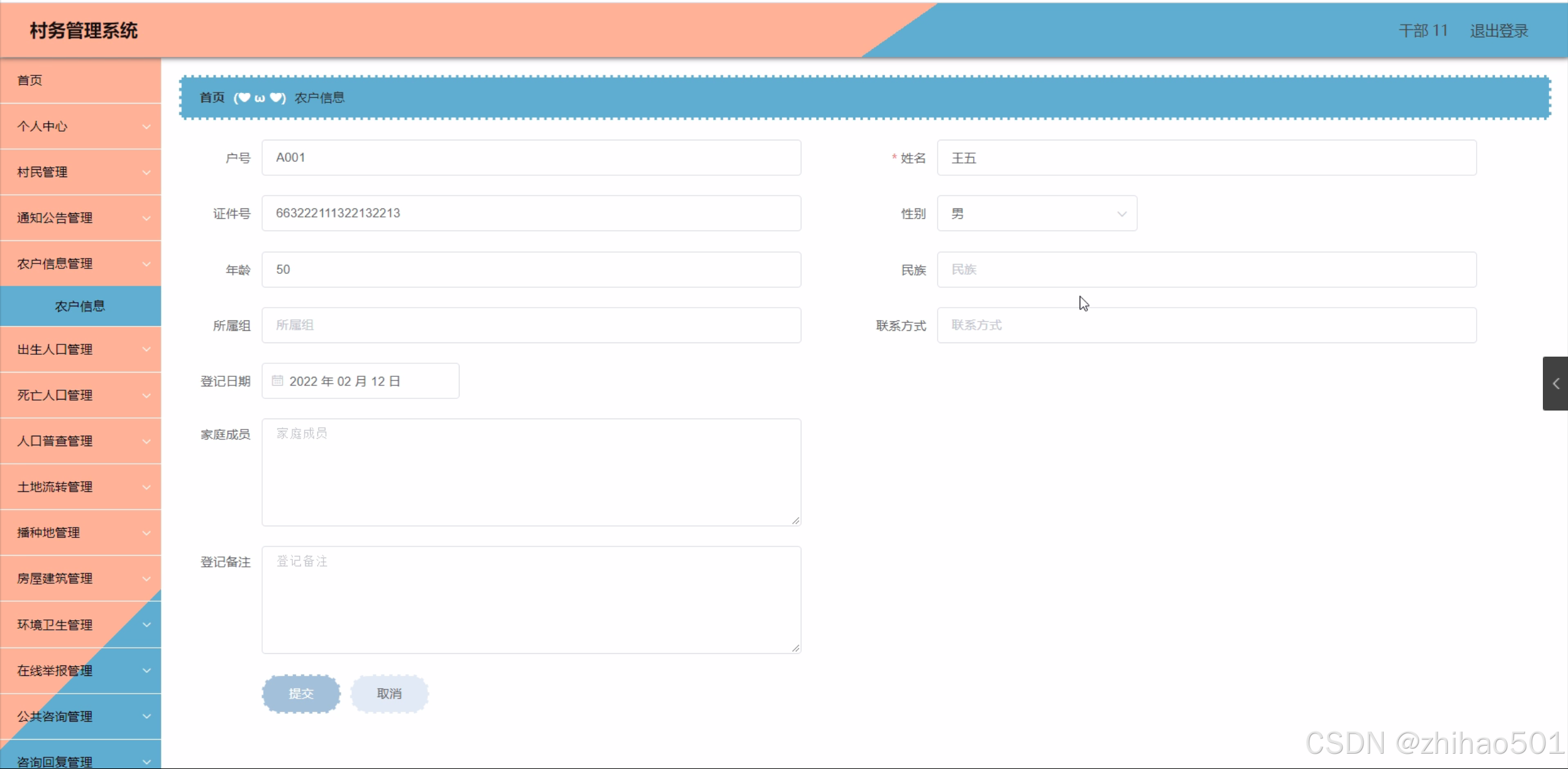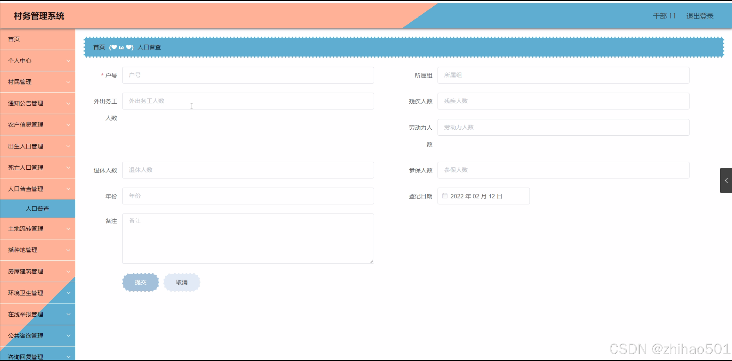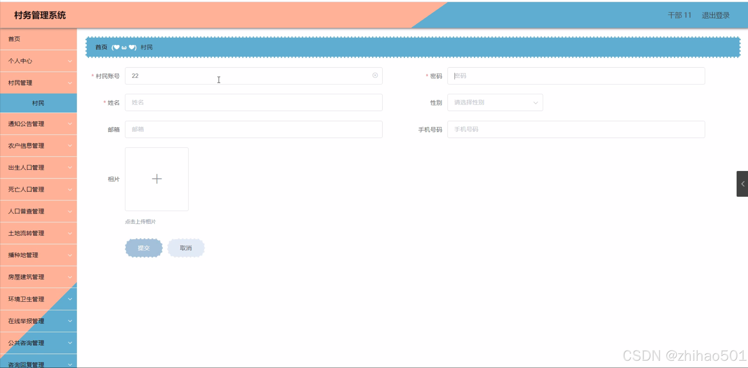 本研究内容将围绕村务管理系统的各项功能展开,包括村民信息管理、干部工作协同、通知公告发布、农户信息登记、房屋建筑管理、环境卫生监督、出生人口与死亡人口登记、人口普查数据管理、土地流转记录、播种地信息管理、投票信息管理、个人投票记录、在线举报处理、公共咨询与回复、评价信息收集等。通过构建这些功能模块,实现村务管理的全面信息化,提高管理效率和服务水平。