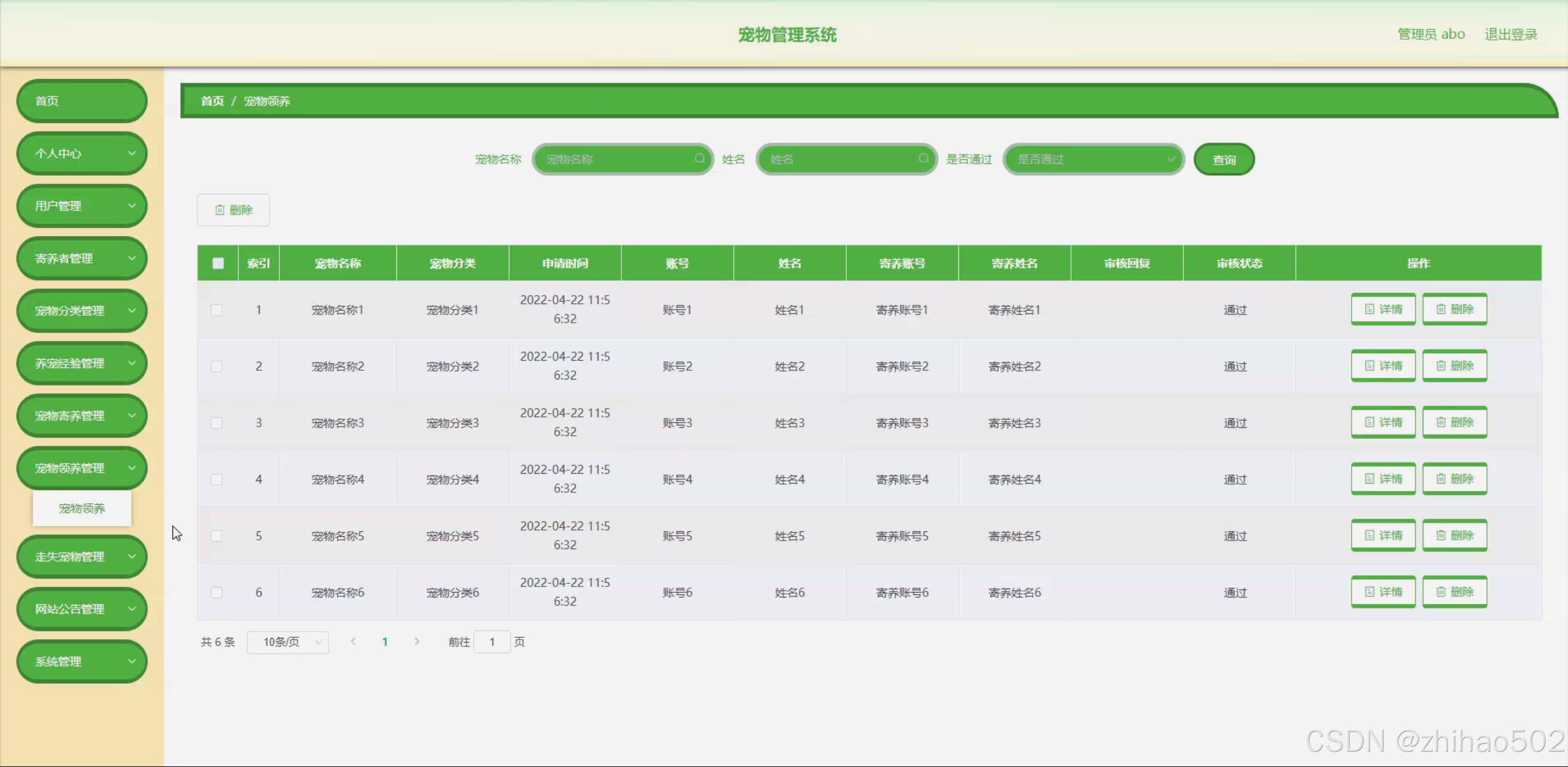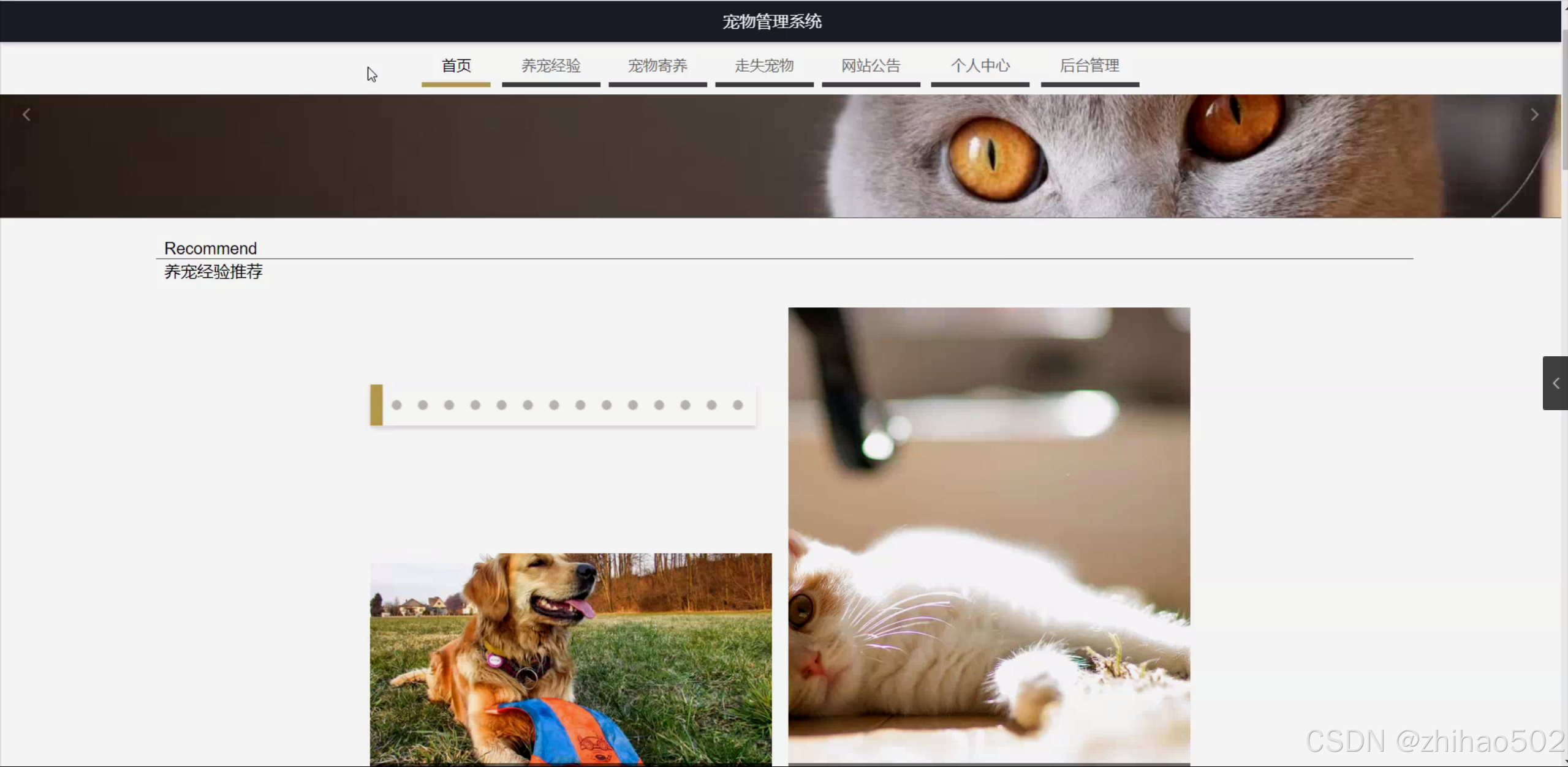 宠物管理系统研究内容主要包括以下功能模块:用户管理模块,实现用户注册、登录、个人信息管理等功能;寄养者管理模块,记录寄养者的基本信息和寄养历史,提供寄养服务预约和评价功能;宠物分类模块,根据宠物的种类和特征进行分类管理;养宠经验模块,提供宠物养护、训练等方面的经验分享和交流平台;宠物寄养模块,实现宠物寄养的申请、审核、安排和结算等功能;宠物领养模块,提供宠物领养信息发布、申请和审核等功能;走失宠物模块,记录走失宠物的信息和找回情况,提供走失宠物发布和查找功能;网站公告模块,发布系统更新、活动通知等系统公告信息。通过这些功能模块的实现,构建一个功能完善、操作便捷的宠物管理系统。
