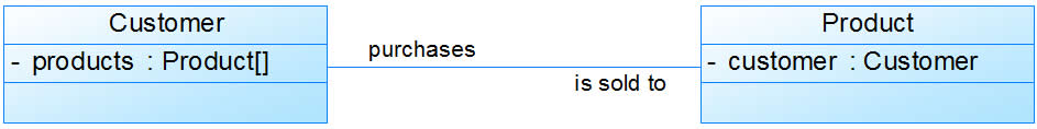 默认情况下,关联是双向的。例如:顾客(Customer)购买商品(Product)并拥有商品,反之,卖出的商品总有某个顾客与之相关联。因此,Customer类和Product类之间具有双向关联关系,如图所示: