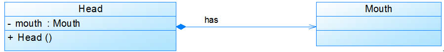 组合也是关联关系的一种特例,他体现的是一种contains-a的关系,这种关系比聚合更强,也称为强聚合;他同样体现整体与部分间的关系,但此时整体与部分是不可分的,整体的生命周期结束也就意味着部分的生命周期结束。在UML中,组合关系用带实心菱形的直线表示。例如:人的头(Head)与嘴巴(Mouth),嘴巴是头的组成部分之一,而且如果头没了,嘴巴也就没了,因此头和嘴巴是组合关系,如图所示