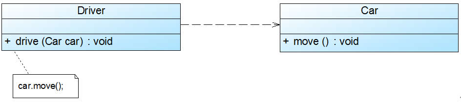 在UML中,依赖关系用带箭头的虚线表示,由依赖的一方指向被依赖的一方。例如:驾驶员开车,在Driver类的drive()方法中将Car类型的对象car作为一个参数传递,以便在drive()方法中能够调用car的move()方法,且驾驶员的drive()方法依赖车的move()方法,因此类Driver依赖类Car,如图所示: