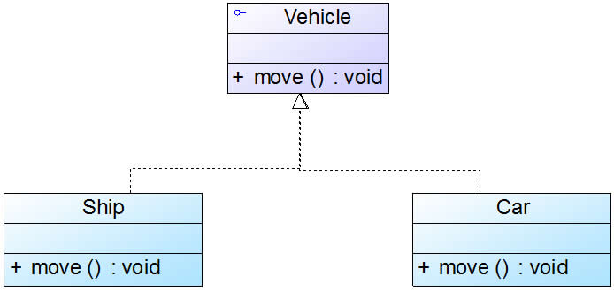接口之间也可以有与类之间关系类似的继承关系和依赖关系,但是接口和类之间还存在一种实现(Realization)关系,在这种关系中,类实现了接口,类中的操作实现了接口中所声明的操作。在UML中,类与接口之间的实现关系用带空心三角形的虚线来表示。例如:定义了一个交通工具接口Vehicle,包含一个抽象操作move(),在类Ship和类Car中都实现了该move()操作,不过具体的实现细节将会不一样,如图所示: