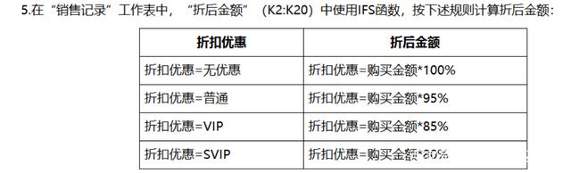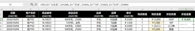 函数公式: =ifs(J2="无优惠",I2*100%,J2="普通",I2*95%,J2="VIP",I2*85%,J2="SVIP",I2*80%)