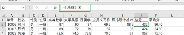02、sum求和函数 功能:对指定参数进行求和 函数格式:=sum(数据区域) 二级例题: 1.在“成绩表”中,完成以下计算: 计算每个学生的“总分”将其放入J2到J503单元中。 函数公式:=sum(E2:I2)