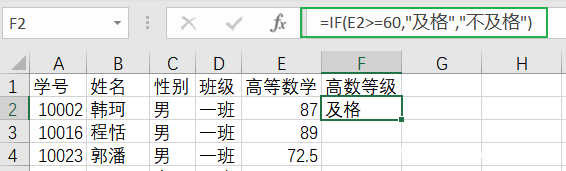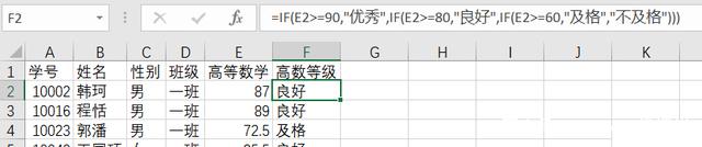 二级例题: 根据“高等数学”列的数据,在F列求出每一个学生的高数等级