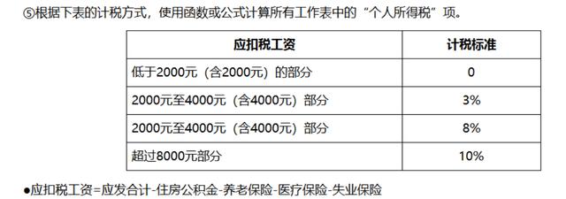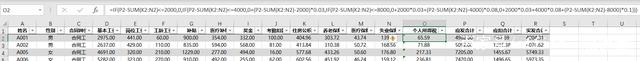 函数公式: =IF(P2-SUM(K2:N2)<=2000,0,IF(P2-SUM(K2:N2)<=4000,0+(P2-SUM(K2:N2)-2000)*0.03,IF(P2-SUM(K2:N2)<=8000,0+2000*0.03+(P2-SUM(K2:N2)-4000)*0.08,0+2000*0.03+4000*0.08+(P2-SUM(K2:N2)-8000)*0.1)))