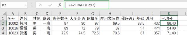 03、average求平均函数 功能:对指定参数进行求平均值 函数格式:=average(区域) 二级例题: 计算每个学生的“平均分”, 将其放入K2到K503单元中,并将区域K2:K503的数值格式设置为小数点后保留2位。 函数公式:=average(E2:I2)