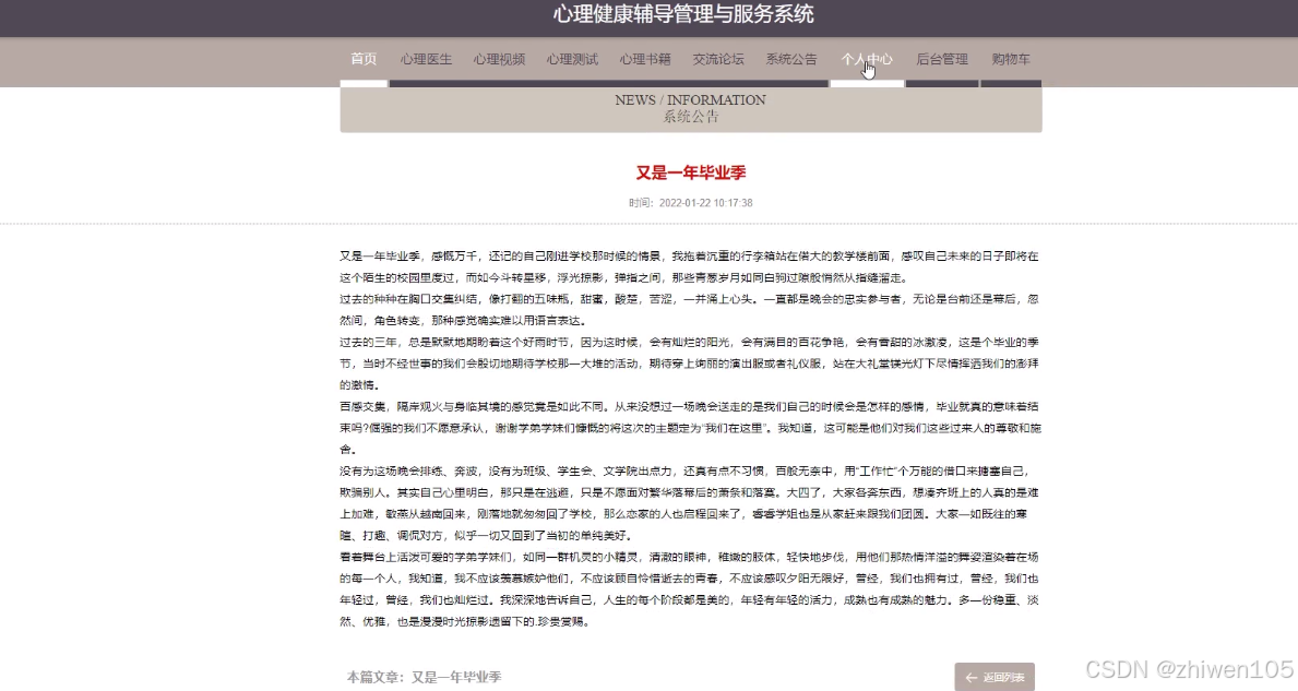 本研究的意义在于,一方面,能够极大地丰富和拓展心理健康服务的供给模式,通过线上平台实现心理健康资源的优化配置,使更多有需要的学生能够及时获得专业的心理帮助。另一方面,系统内置的个性化心理测试、视频分类、心理书籍等功能,不仅能够增强学生的自我认知与自我调节能力,还能引导他们形成积极向上的心态,促进心理健康素养的全面提升。此外,该系统还有助于心理医生更加系统地管理患者信息,优化咨询流程,提高工作效率,从而推动心理健康服务行业的专业化、信息化发展。