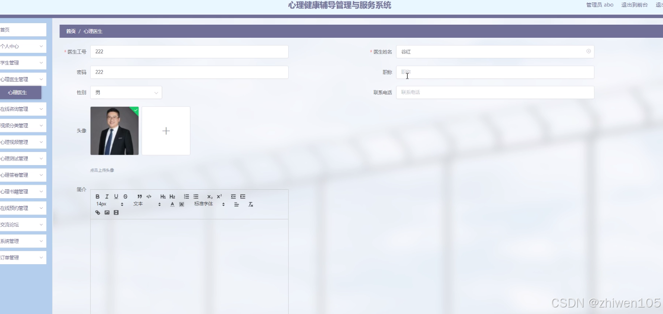 随着社会节奏的加快与生活压力的增大,心理健康问题日益成为影响个人成长、家庭和谐乃至社会稳定的重要因素。当前,高校及社会各界对心理健康的关注度不断提升,但传统的心理健康辅导方式存在资源分配不均、效率低下、覆盖面有限等问题。因此,构建一个集信息管理、在线咨询、资源分享与个性化服务于一体的心理健康辅导管理与服务系统显得尤为重要。该系统旨在通过数字化手段,打破时空限制,为学生提供便捷、高效的心理支持渠道,同时促进心理医生工作效率与服务质量的双重提升。