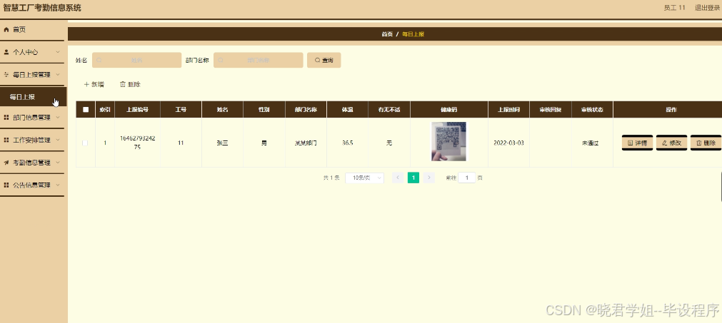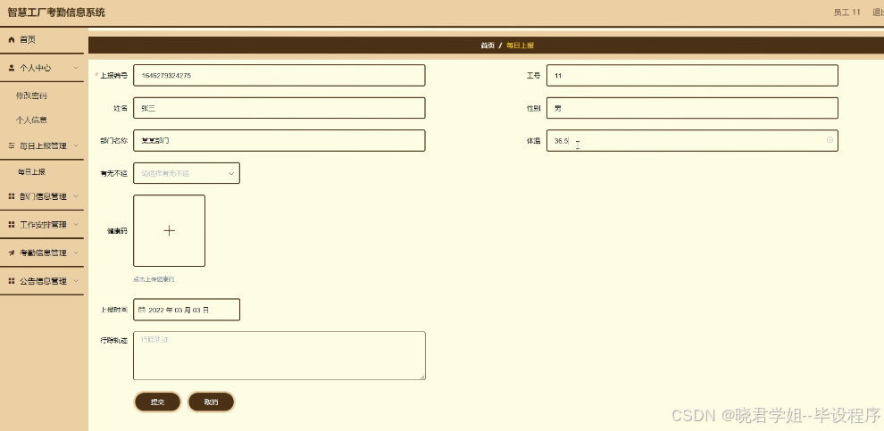 - 健康上报模块:设计一个方便员工使用的健康上报界面,员工可以填写健康状况、体温等信息。同时,系统要能够对健康数据进行存储和分析,如发现异常情况及时提醒相关人员。