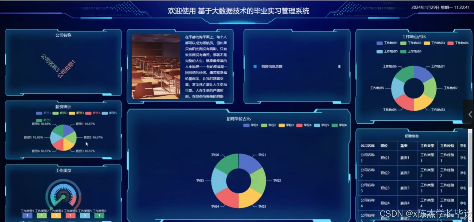 - 招聘信息模块(zhaopinxinxi):研究如何高效整合各类实习招聘信息,通过大数据分析技术筛选出与学生专业匹配度高的信息,并精准推送。同时,对招聘企业的信誉和实习岗位质量进行评估,保障学生权益。