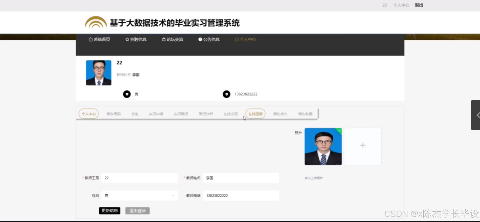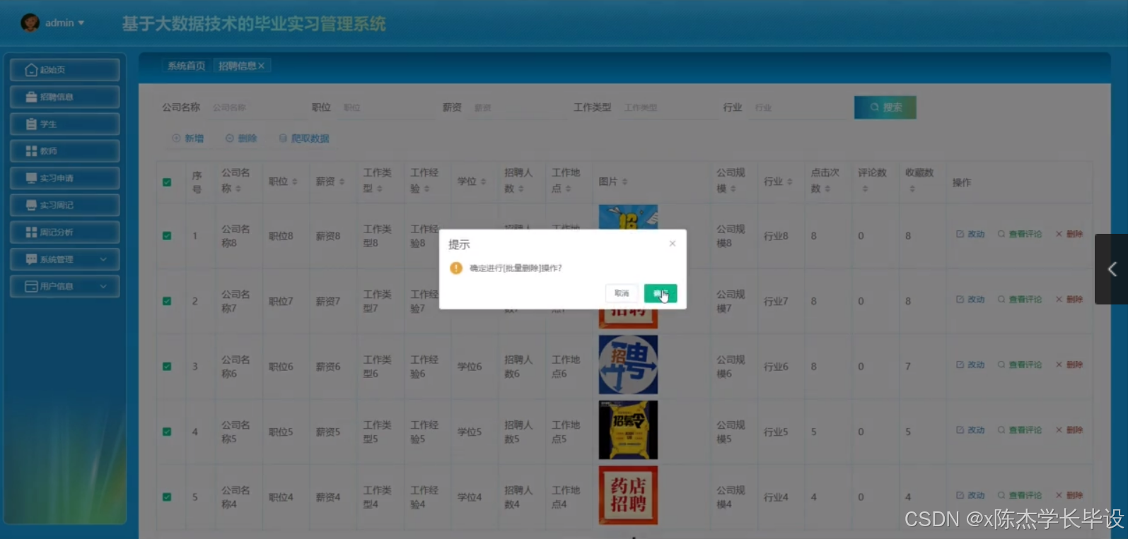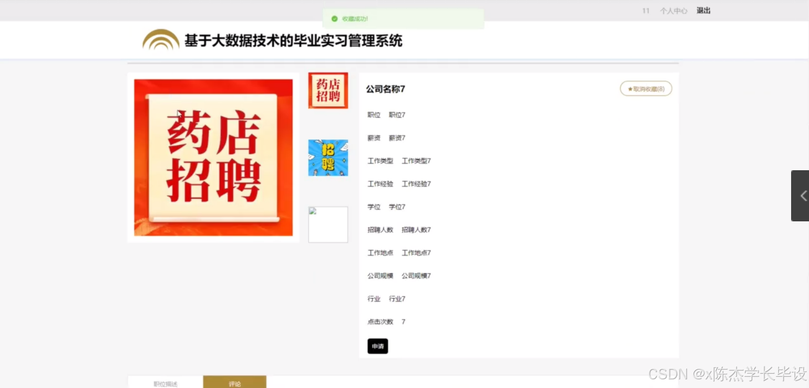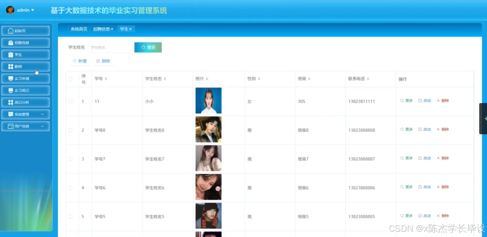 - 完成基于大数据技术的毕业实习管理系统的设计与开发,系统具备招聘信息发布与推送、学生与教师信息管理、实习申请处理、实习周记提交与分析、在线交流与回复等功能,且各功能模块稳定运行。