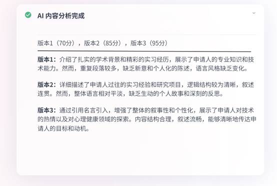 - 版本3(95分):达到高分范例,系统特别赞赏其“引用名言引入,增强叙事性与个性化”,并认可其“结构合理,流畅传达申请人的目标与动机”。这显示出AI招生官对文书“灵魂”的重视——你是否通过故事展现了真实的自己?
