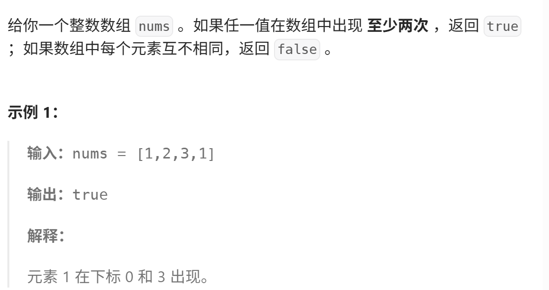 今天写217题:存在重复元素,发现了自己的短板-->基础知识不扎实,很多基础的数据类型不会使用,一些方法不了解。导致代码写不出来,知识面太窄了。
