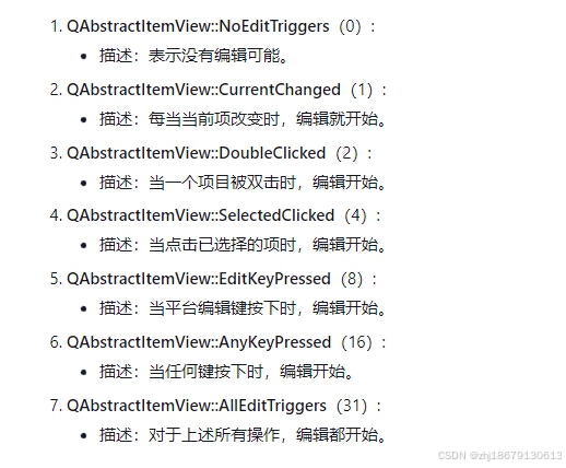 该属性值是标准类型QAbstractItemView::EditTriggers ,是枚举类型QAbstractItemView::EditTriggers 的枚举值的组合,各枚举值的含义如下。