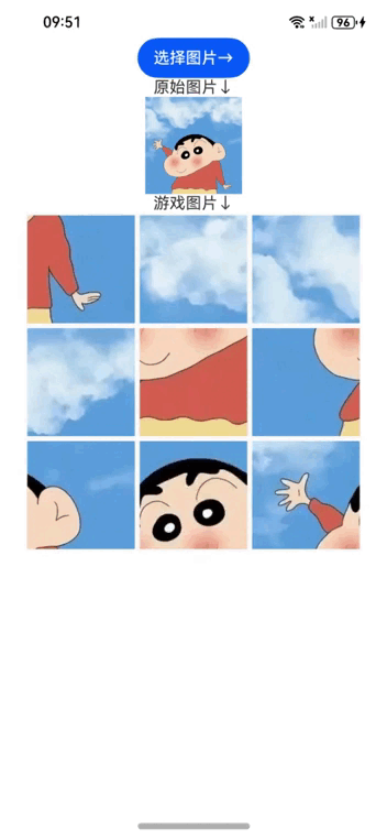 用户可以通过点击“选择图片→”按钮来从设备相册中选择一张图片,程序会将所选图片复制到应用的私有目录下,并显示出来。接着,程序将加载的图片分割成3x3的拼图块,并将这些拼图块以打乱的方式展示在界面上。用户可以点击拼图块进行交换,以恢复图片的原始顺序。当拼图正确完成时,会弹出一个提示对话框通知用户“拼图完成”。