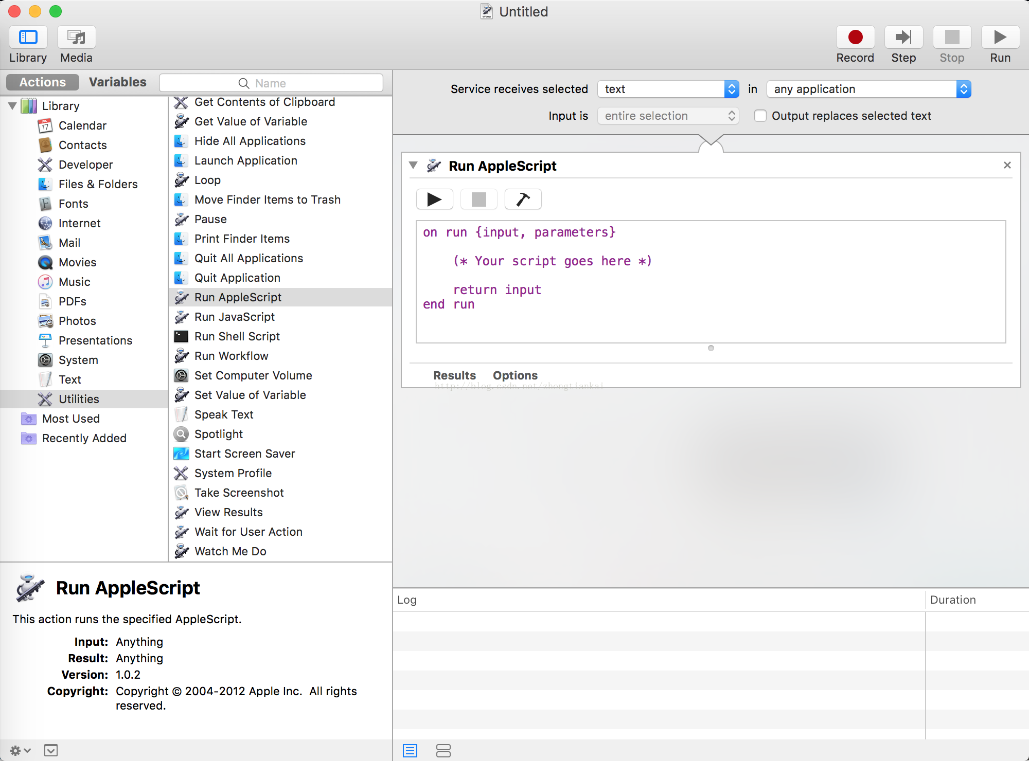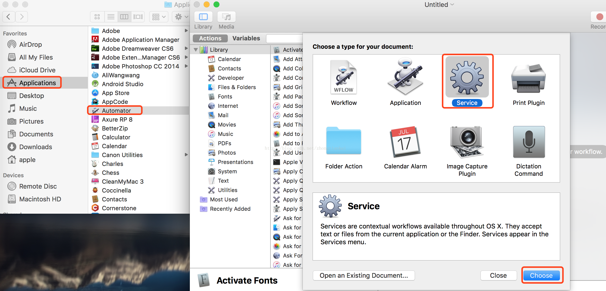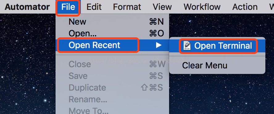 保存好Open Terminal后,退出Automator.app,然后重新打开,执行以下操作