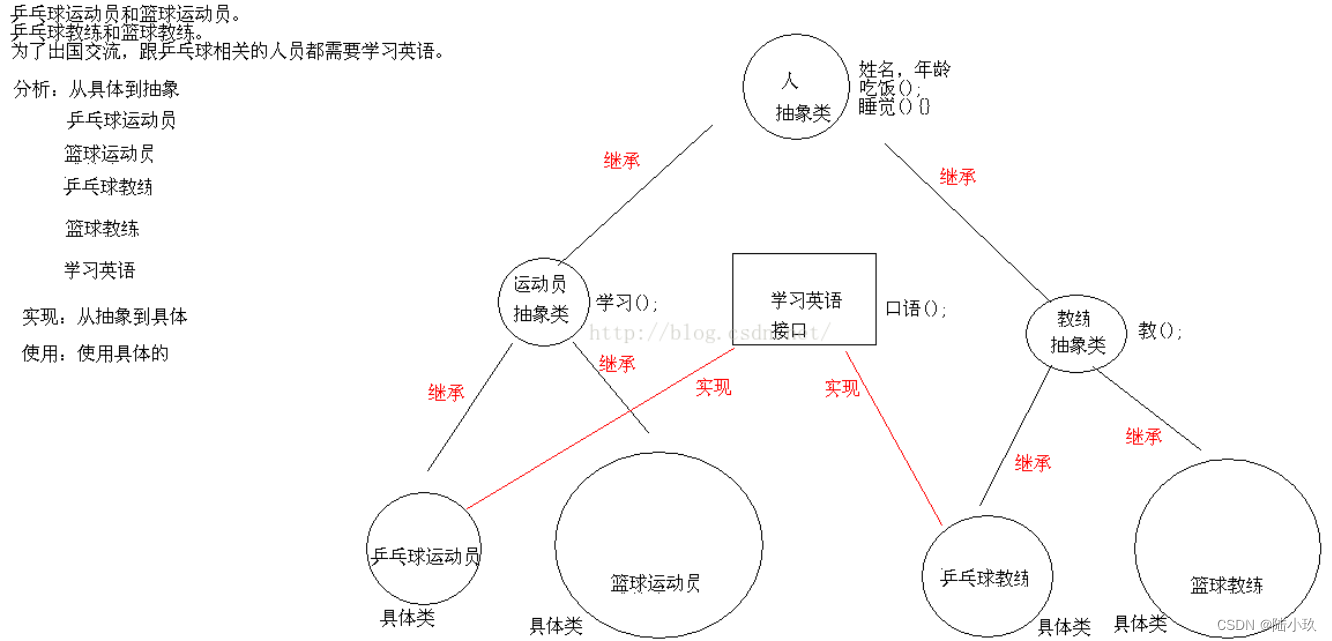 interface 中的方法默认为**public** abstract (public、abstract可以省略),变量默认为public static final;类中的方法全部都是抽象方法。只有声明没有实现,在不同类中有不同的方法实现。