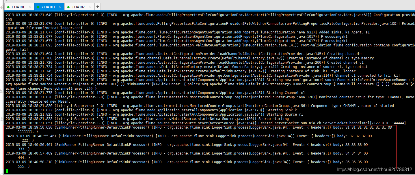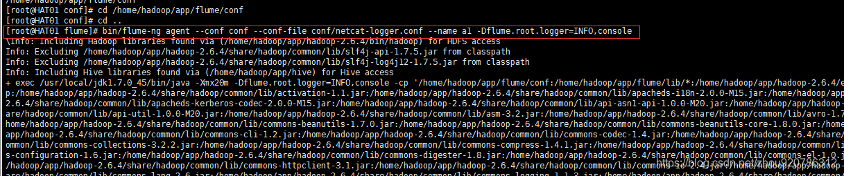 [root@HAT01 flume]# bin/flume-ng agent --conf conf --conf-file conf/netcat-logger.conf --name a1 -Dflume.root.logger=INFO,console