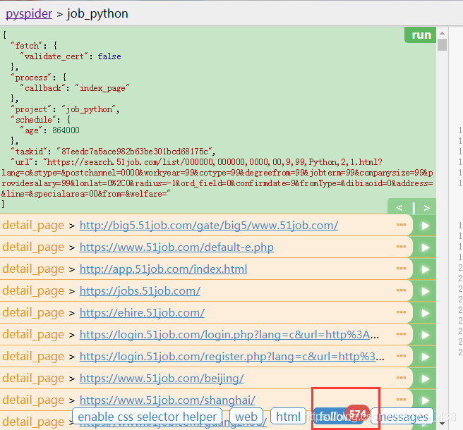 也就是出现了,574个我们空可以进行进一步爬取的信息,其实这里的多数是没有价值的,因为我们只需要中间部分,我们默认爬取的是凡是含有http的都进行爬取