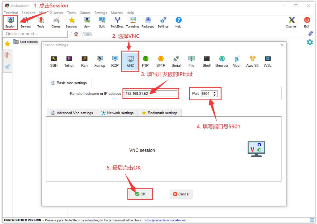 a.首先点击 Session,然后选择 VNC,再填写开发板的 IP 地址和端口,最后点击 OK 确认