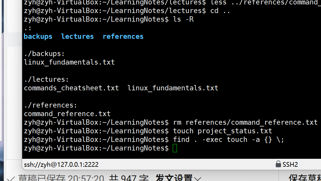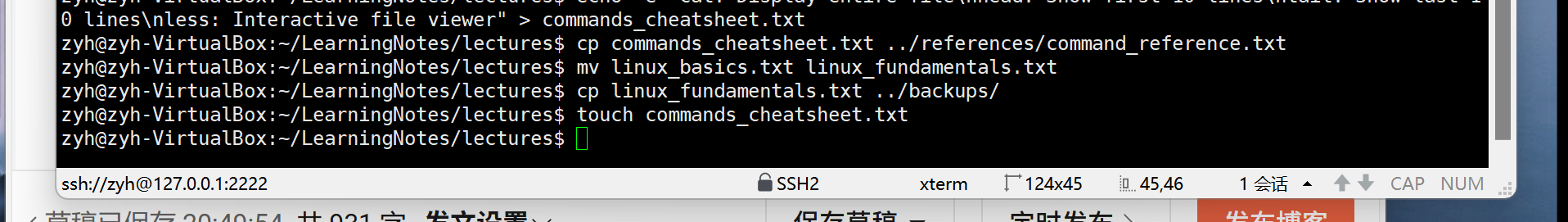 • 为linux_fundamentals.txt创建一个备份文件到backups目录