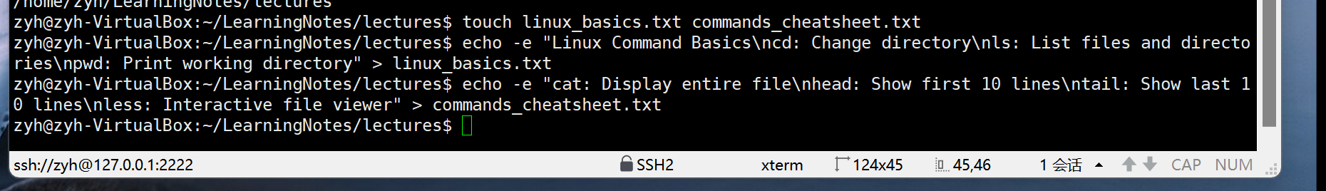 • 创建一个名为"linux_basics.txt"的笔记文件