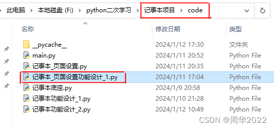 在"记事本项目" --> "code"目录下新建了一个"记事本_页面设置功能设计_1.py"文件,开始本阶段的项目设计开发,如下图: