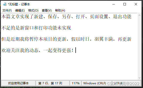 1editText: ['本篇文章实现了新建、保存、另存、打开、页面设置、退出功能\n\n不足的是新窗口和打印功能未实现\n\n但是近期我将暂停本项目的更新,假以时日,羽翼丰满,再更新\n\n欢迎关注我的动态,一起变得更强!\n']