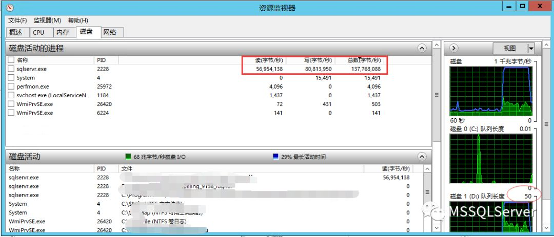 数据库所在的磁盘D在进行着大量的读写操作,D盘的队列的长度也异常的到达了50。同时CPU、内存也都大量的使用。