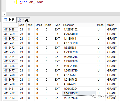 在大量的extent(8个连续的页)上存在更新锁,当然我们还可以看到数据库级别加密扫描的共享锁。