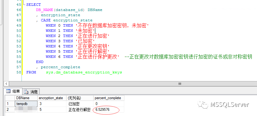 WHEN 6 THEN '正在进行保护更改' --正在更改对数据库加密密钥进行加密的证书或非对称密钥