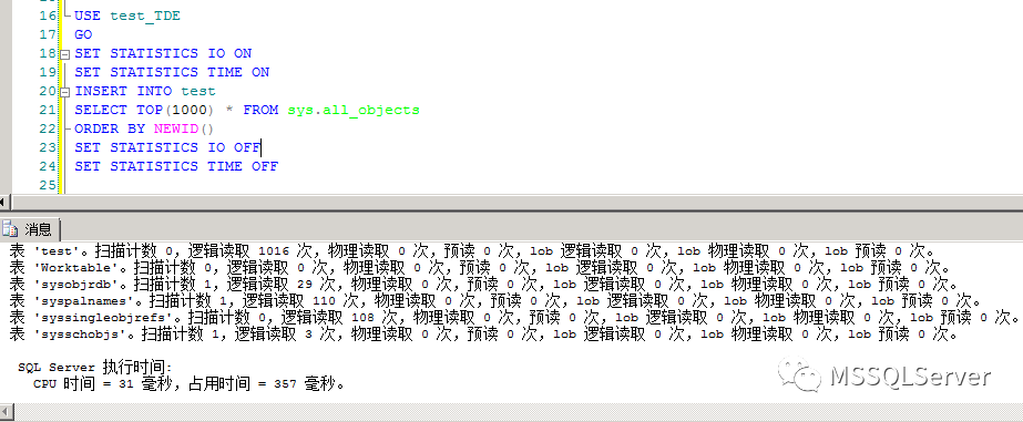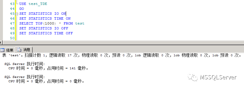 两次查询逻辑读一样,TDE的查询占用时间反而低于非加密数据库的时间。单次测试可能存在较大误差。