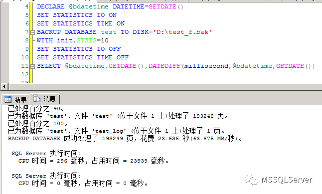 BACKUP DATABASE 成功处理了193249 页,花费23.636 秒(63.875 MB/秒)。