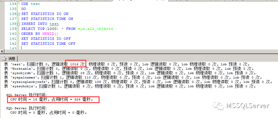 CPU 时间= 0 毫秒,占用时间= 0 毫秒。