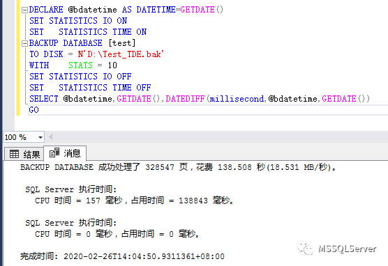 BACKUP DATABASE 成功处理了 328547 页,花费 138.508 秒(18.531 MB/秒)。