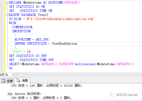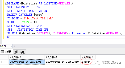 下面我们将通过试验对比数据库备份时对数据库备份文件进行加密和TDE,我们使用《SQL Server 透明数据加密(TDE)的影响》一文中test数据库,为了保证数据库数据量一致,减少其他因素的影响,我们先使用WITH ENCRYPTION加密选项对数据库test进行备份: