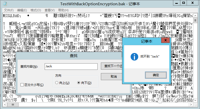 接下来,我们使用记事本打开数据库备份文件,查找“Jack”,我们发现,查不到明文“Jack”,验证确实达到了加密的效果。