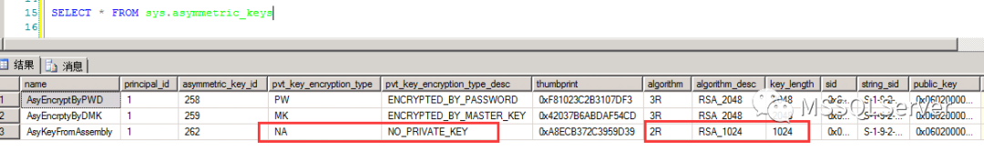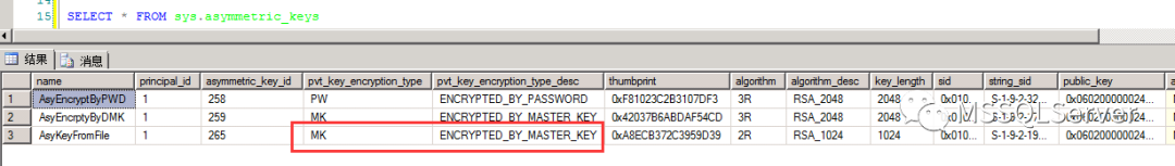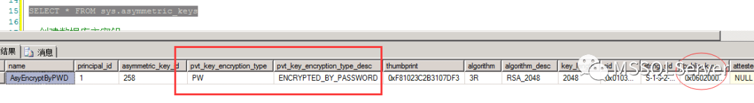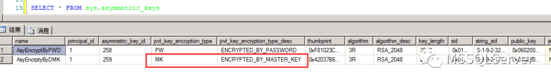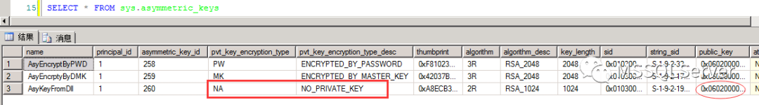 从动态视图sys.asymmetric_keys 我们可以清楚的看到,该非对称密钥是使用密码加密的,同时我们可以看到,在这里有个公钥字段public_key,这个是对称密钥所没有的。