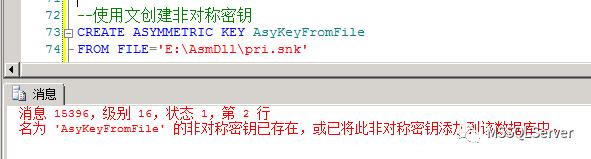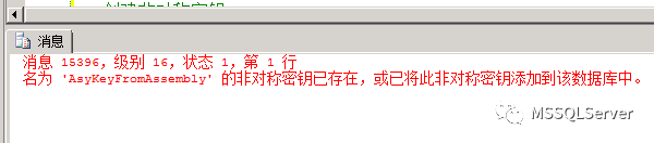 因为我们上文使用UDF_CLR.dll 创建了非对称秘钥,即使用同一个dll创建非对称秘钥,无论是直接使用dll文件创建,还是间接的使用程序集创建,这两个非对称秘钥是相同的,所以会报非对称秘钥已经存在的错误。