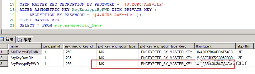 和从dll创建非对称秘钥、从程序集中创建非对称秘钥不同的是,从文件中创建的非对称秘钥是使用数据库主秘钥进行加密的(因为本文前面创建数据库主秘钥加密的非对称秘钥中已经创建了DMK,否则在从文件中创建非对称秘钥之前需要先创建DMK)。