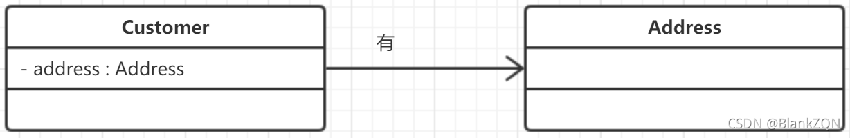 我们可以看到,在UML类图中单向关联用一个带箭头的直线表示。上图表示每个顾客都有一个地址,这通过让Customer类持有一个类型为Address的成员变量类实现。