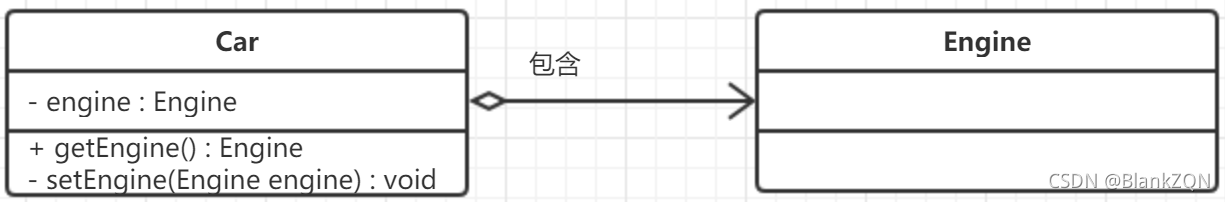 上图中的Car类与Engine类就是聚合关系(Car类中包含一个Engine类型的成员变量)。由上图我们可以看到,UML中聚合关系用带空心菱形和箭头的直线表示。聚合关系强调是“整体”包含“部分”,但是“部分”可以脱离“整体”而单独存在。比如上图中汽车包含了发动机,而发动机脱离了汽车也能单独存在。